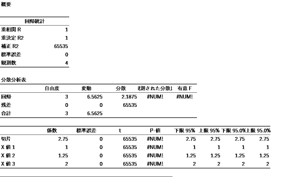 上記データをExcelで回帰分析すると、以下のように結果が表示されます。