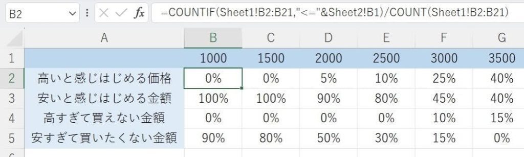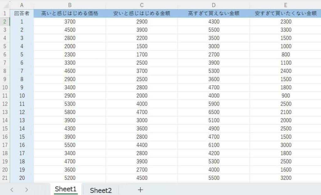 回答データは、Excelで各質問の価格を以下のように集計します。