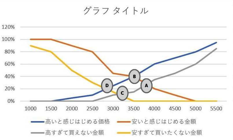 作成したグラフの4つの交点(上記A~D)をもとに「上限価格」「下限価格」「妥協価格」「理想価格」を確認します。