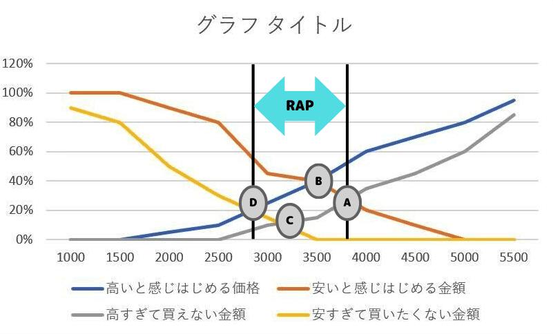 PSM分析では、「上限価格から下限価格の間」を市場における許容可能価格帯(RAP:Range of Acceptable Price)と判断します。