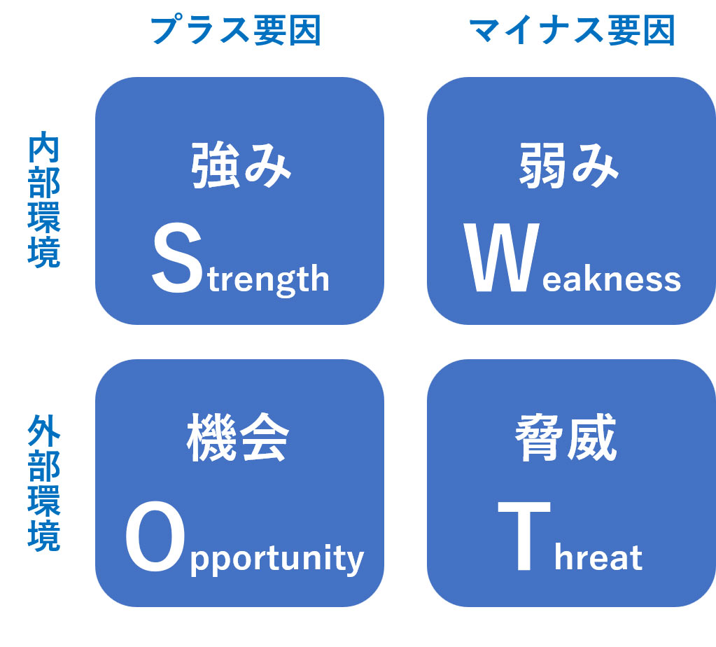 SWOT分析はこれらをわかりやすく分析できる手法であり、マーケティングや営業活動など、あらゆる事業戦略の策定に活かすことができます。