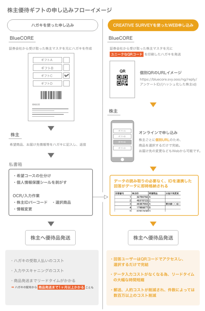 キャンペーンの事例と同じように、株主優待ギフトの申込み受付からデータ化、発送までの工数を削減するためにCREATIVE SURVEYを活用しています。