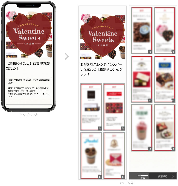 例えば、浦和パルコで実施したバレンタインシーズンの抽選キャンペーンが好評でした。浦和パルコで販売しているバレンタイン商品の画像を応募フォーム内に掲載し、お客様が興味のある商品を選択すると抽選に参加ができるというもの。当選商品は、浦和パルコで使えるお買物券やお食事券でした。