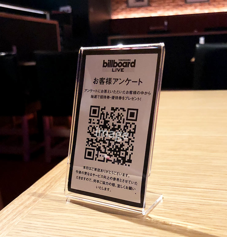 CREATIVE SURVEYは、主にBillboard Liveにご来場いただいたお客様のアンケートに使用しています。アクリルケースに入れたQRコードを店舗の会場内の各テーブルに設置し、ライブの感想やサービスの満足度などを聞いています。