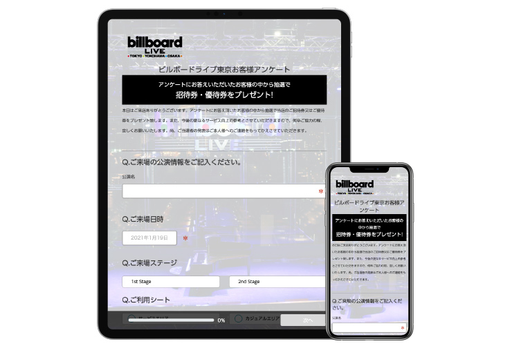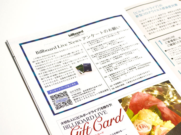 また、2020年からスタートした配信ライブのアンケートや、毎月発行している情報誌『Billboard Live News』の読者アンケートにもCREATIVE SURVEYを使用しています。配信ライブのアンケートは、画面にアンケートURLを提示する形で、ライブの感想のほか、チケットの購入時期や視聴方法(生配信かアーカイブか)などを聞いています。
