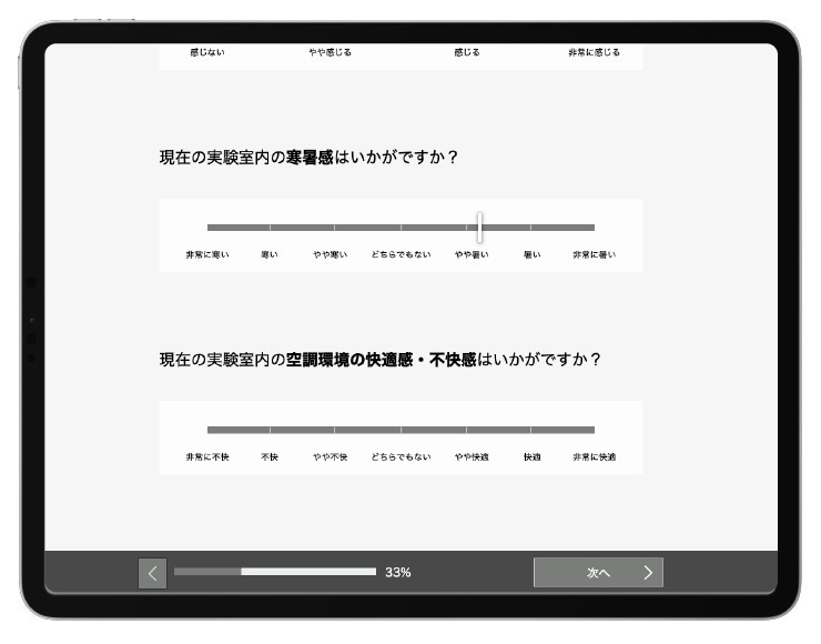 被験者による評価は、設備や環境条件を変えながら複数回行うため、20~30問のアンケートを数回実施します。実験によっては、一人の被験者に同じ内容のアンケートを10回くり返しお答えいただくこともあります。