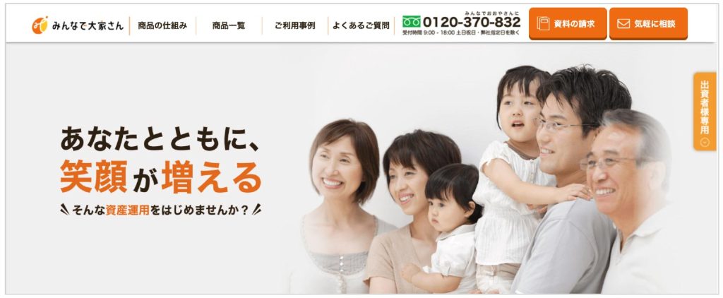 当社の主な事業内容は、不動産投資商品「みんなで大家さん」の販売代理事業です。 個人で不動産投資を行うには莫大な初期費用がかかりますが、「みんなで大家さん」は1つの不動産を小口化した商品を販売しており、少ない金額で不動産投資を始められ、出資者の方は対象不動産の各テナントの家賃収入から、分配金を受け取ることができます。