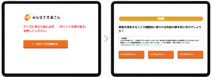 主な用途は、契約後のお客様に月1回実施している「リレークイズ」の作成・配信です。リレークイズは、数問のクイズにお答えいただいたお客様に、ギフトカードを贈呈するプレゼント企画。1問正解するごとにポイントが付与され、正解数によってギフトカードの金額が決まります。