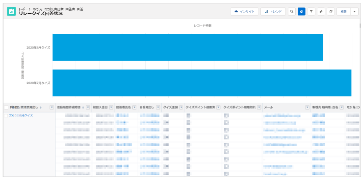 「CREATIVE SURVEY for Salesforce」によるリレークイズは、「契約後のフォロー」のステータスに該当するお客様に配信。お客様の個別の回答状況や獲得ポイントは「回答確認レポート」で確認できるようになっています。