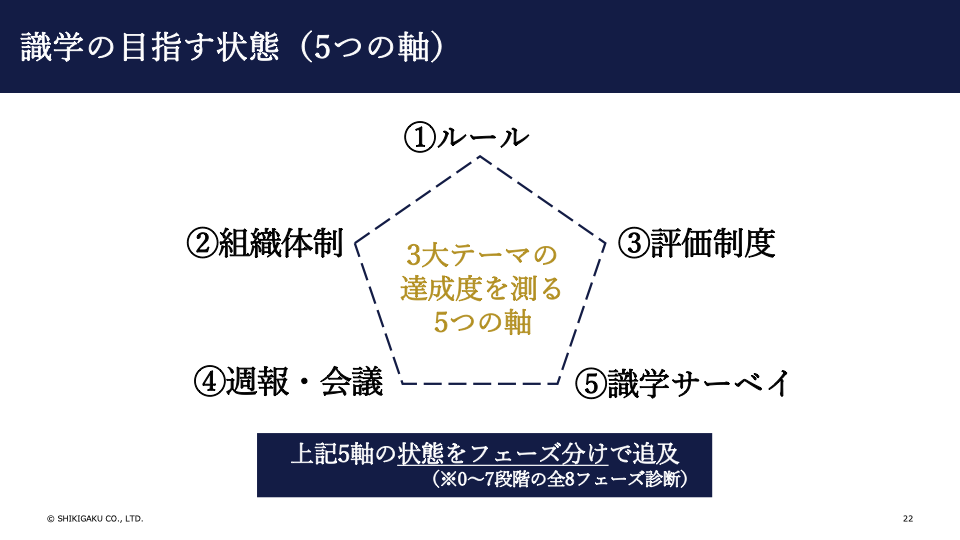 長島:メインとなる活用は、カスタマーサクセスマネージャーが各社のフェーズ診断を実施する際のアンケートです。診断ではフェーズ0から 7の区分があり、チェック項目は「ルール」「組織体制」「評価制度」「週報・会議」「識学サーベイ」の5つの軸があります。
