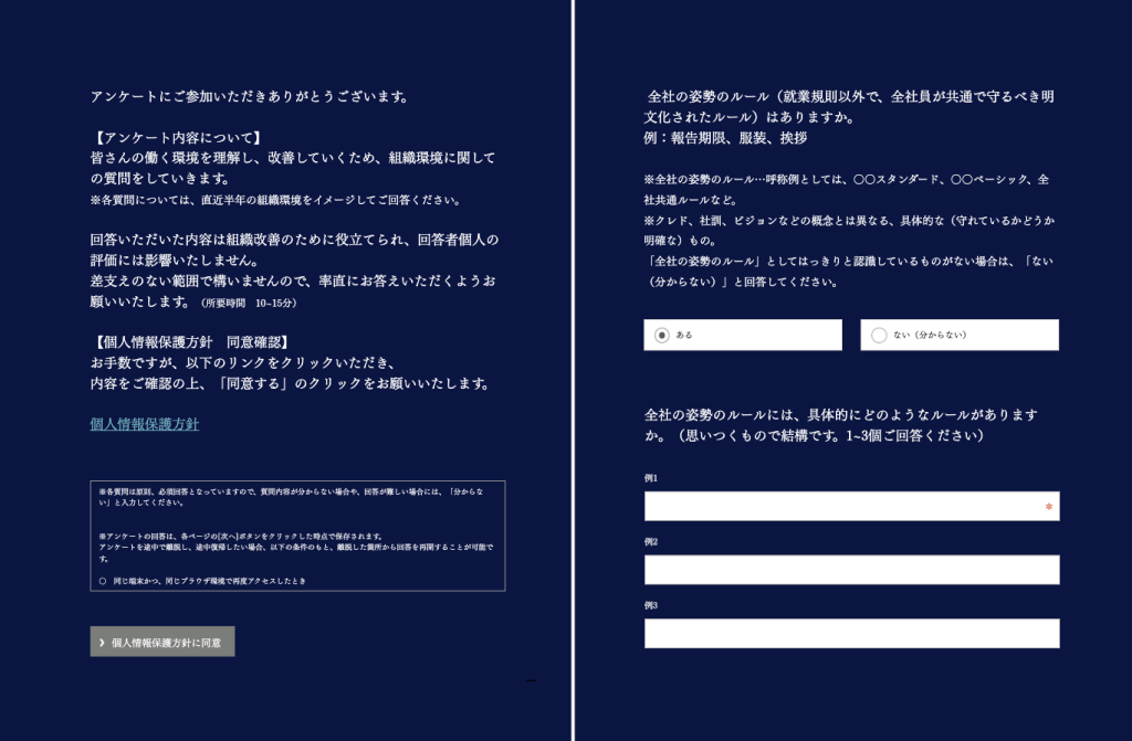 たとえばルールのところでいうと、コンサルタントがOKとしているルールを全員認識していて更新がフロー化されていると確認できたときは「できている」という診断になります。その状態をチェックするために、「ルールがあることを知っていますか?」「そのルールは何ですか?」「ルールを見直す仕組みがありますか?」というように質問項目を設定して、識学の浸透度を診断している形です。