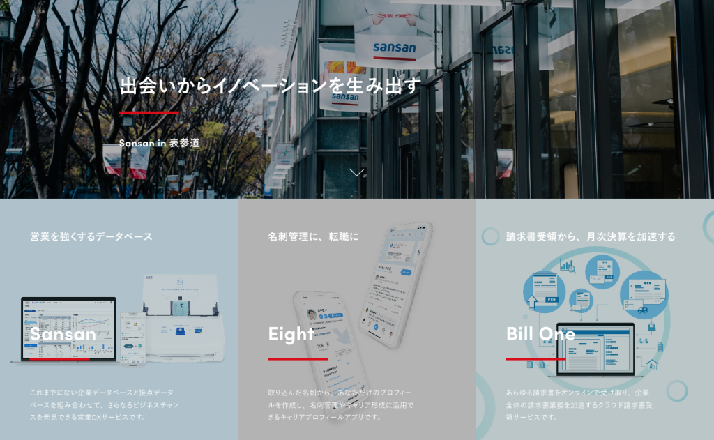 大きくは、企業データベースと接点データベースを組み合わせてビジネスチャンスの発見につなげていく営業DXサービス『Sansan』、名刺をスキャンするだけで自分だけのプロフィールを自動作成できるキャリアプロフィール『Eight』、バックオフィス業務の効率化を促進するクラウド請求書受領サービスの『Bill One』、クラウド契約業務サービスの『Contract One』などを展開しています。