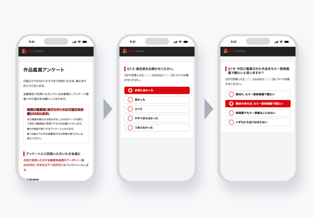 新型コロナウィルスに関連したもので、映画館に来場された方の意識調査のようなものを行っています。例えば弊社が行っている感染予防対策を記載し、それに対してどう思うかですとか、感染予防対策への意識についてお伺いしています。