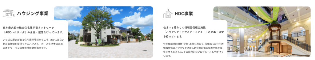 現在は総合住宅展示場「ABCハウジング」の企画・運営をしているハウジング事業、住まいと暮らしの総合ショールーム施設「ハウジング・デザイン・センター」の企画・運営をしているHDC事業を中心に、広告代理業、保険代理業、不動産事業、WEBメディア事業を展開しています。