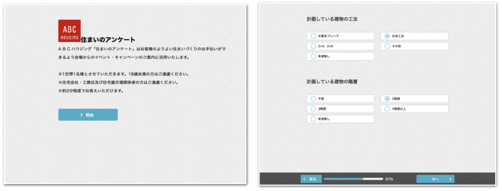 1つ目はメインの活用となるご来場アンケートです。ご来場の目的や購入意向、検討している住宅メーカーなどの情報をヒアリングしています。