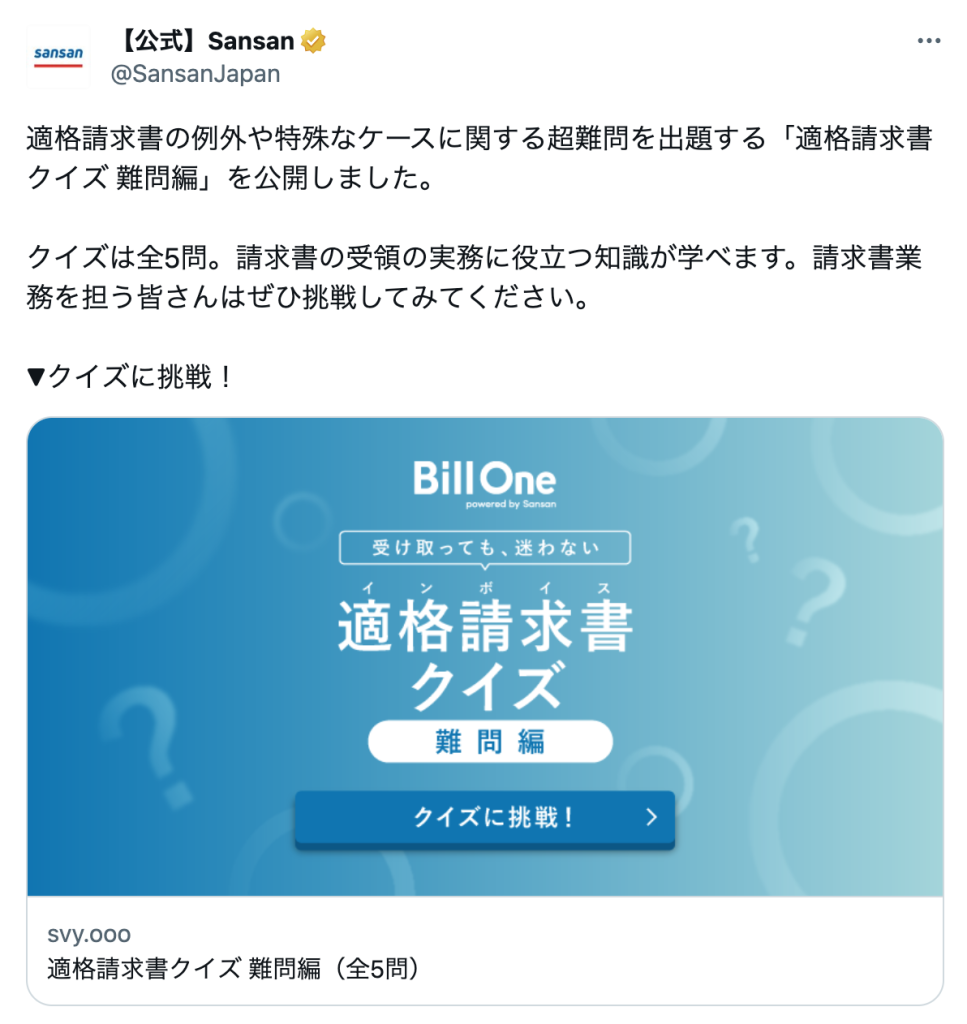 その中で、Bill OneのPRと、経理の方に役立つ情報の、両方を兼ね備えたコンテンツとしてインボイスクイズを企画しました。