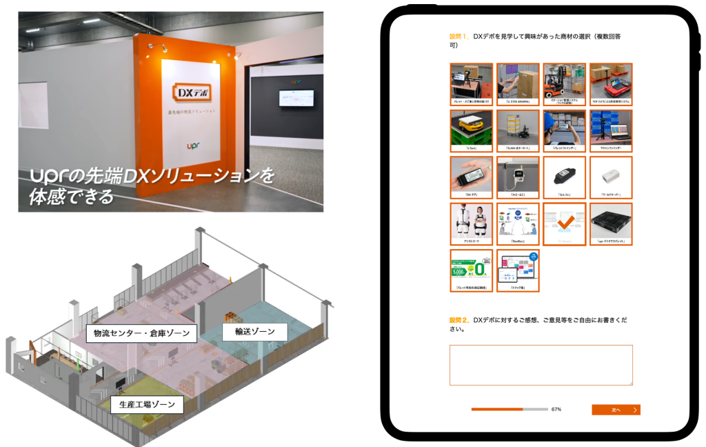 弊社のサプライチェーン全体における先端DXテクノロジーを集結させた「DXデポ」においては来場者に向けたアンケートの実施にも活用しています。当初は紙媒体でのアンケートを予定していましたが、回答の転記の工数などを考慮すると現実的ではないと考え、CREATIVE SURVEY for Salesforceを用いた形式に変更し、アンケート回答をSalesforceにも連携しています。
