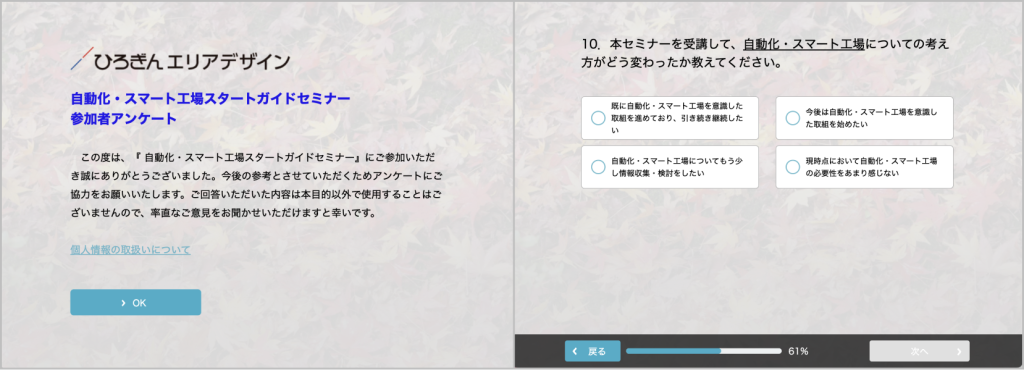 中国地域のものづくり企業等における、スマートファクトリーをはじめとした自動化・デジタル化等への対応促進を図る目的で「自動化・スマート工場スタートガイドセミナー」というセミナーを開催し、終了後にお送りする御礼メールに、回答用URLを記載し回答のお願いをしました。