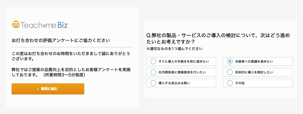 お客様からのフィードバックやお声から新人自身が学べることもありますし、マネージャーがその情報をもとにフォローをすることもできます。また、商談時に得られなかった有益な情報を得られることもあるのでは、という考えからサーベイの導入が決定しました。