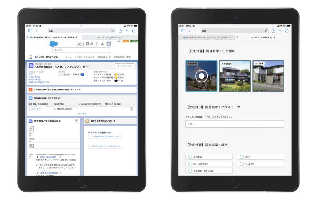 他方、外勤スタッフの負荷軽減の面から、プロジェクトの要の一つとして、帳票を絡めた業務改善とUI改善にも取り組みました。弊社が施工させていただいた施主様(お客様宅)に、定期的にサービススタッフが訪問し、そこで点検した内容を記す「メンテナンス報告書」という帳票があるのですが、これが紙ベースであったためにサービススタッフが記入する工数やそれをシステムに転記する工数も発生しておりました。これを全て電子化し効率的にSalesforceへデータ蓄積できる仕組みをCREATIVE SURVEY for Salesforceを活用して整えました。