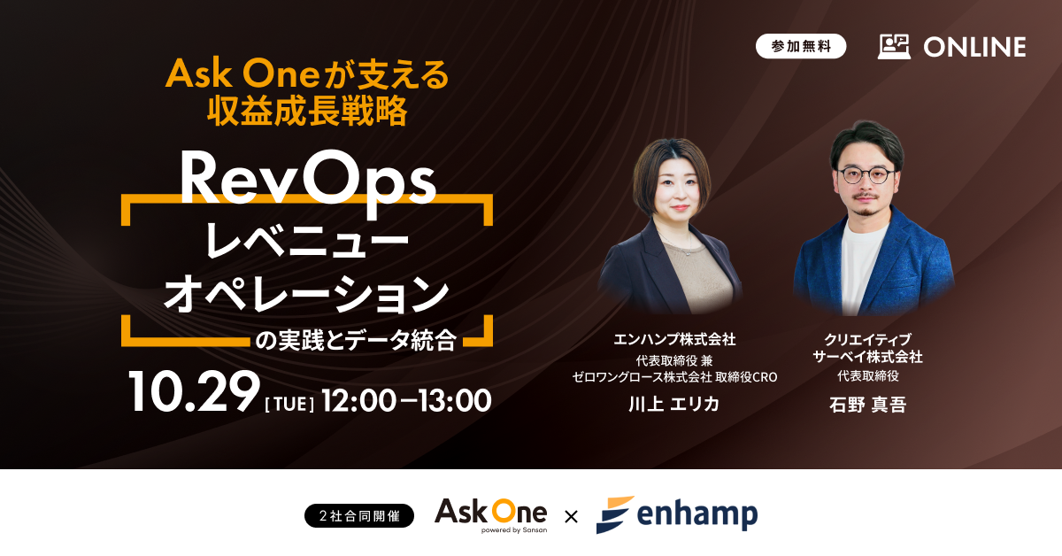 本セミナーでは、『レベニューオペレーション(RevOps)の教科書』の著者である川上エリカ氏をお迎えし、RevOpsの基本概念から実践方法、データ統合の重要性について詳しく解説いただきます。さらに、Ask Oneを活用したデータ収集や統合がどのようにして営業機会の最大化や顧客体験の向上に寄与するかを具体的な事例を交えながらご紹介します。
