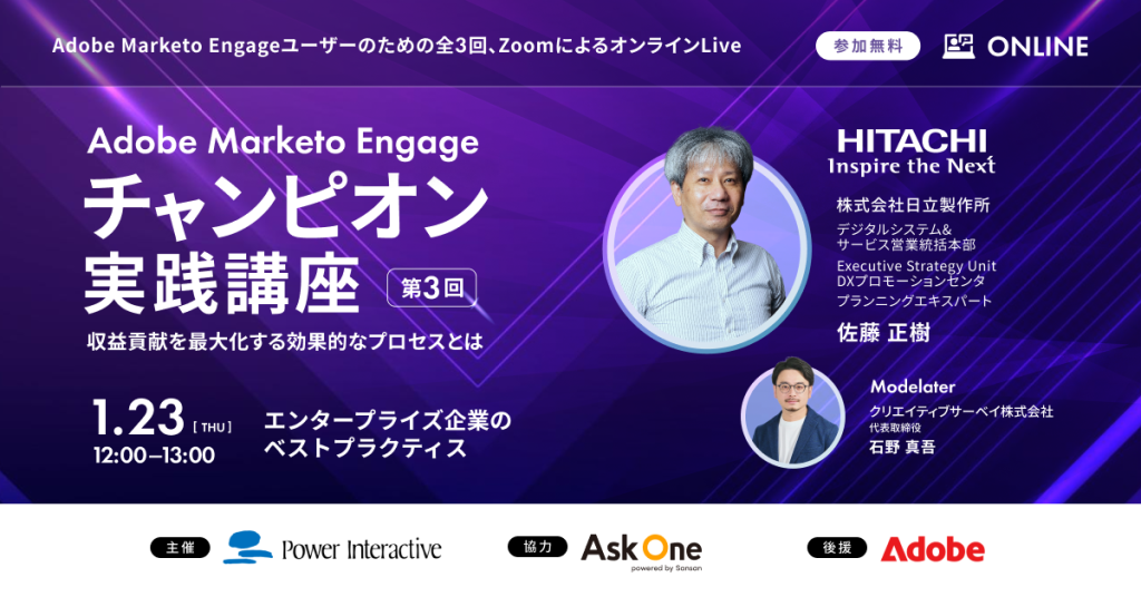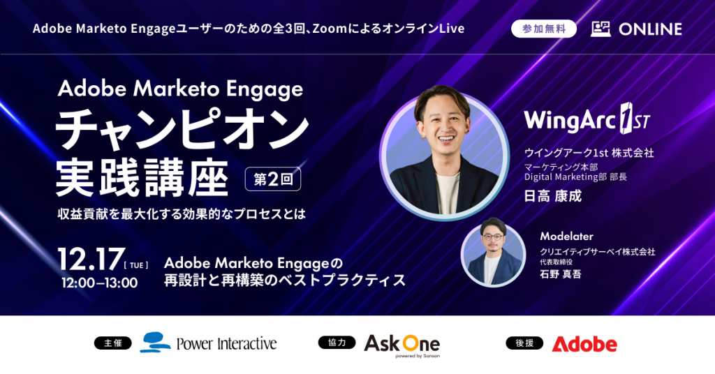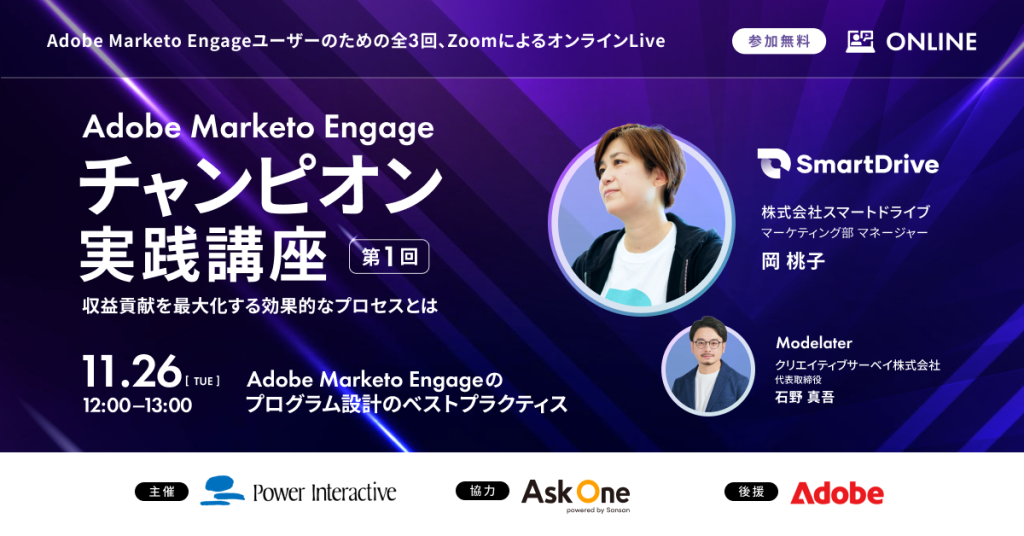 Adobe Marketo Engageは非常に柔軟で優れたツールである一方、機能の複雑さから十分に活用されていないケースも少なくありません。本講座では、収益貢献を最大化するためのAdobe Marketo Engageの効果的なプログラム設計・構築・運用事例などの最適な実践方法を3回に渡って解説します。毎回、Adobe Marketo Engageのチャンピオンとなったゲストが登壇し、自社の取り組みを紹介しながらベストプラクティスを共有します。