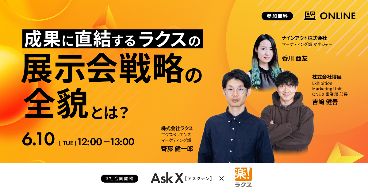 Ask Xセミナーのシリーズ第7弾となる今回は、年間多くの展示会に戦略的に出展し、事業成長を実現しているラクス様に、「なぜ展示会施策に注力をするのか」、「どのような出展戦略を描いているのか」、出展時の工夫、顧客フォローの方法など、成果を上げるためのノウハウを深掘りしてお伺いします。皆様からのQ&Aをメインにしたインタラクティブなセミナーになりますので、ラクス様にお話を聞いてみたい!という方大歓迎です。