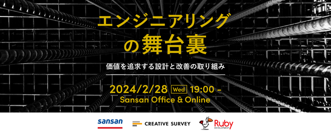 株式会社Ruby開発、クリエイティブサーベイ株式会社、Sansan株式会社が共同で各社のエンジニアリングの取り組みについて発表するイベントを開催します。