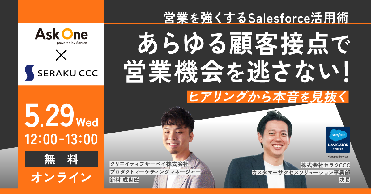 顧客の本当の声を集め、受注確度の高い顧客に効果的にアプローチするための方法を学びませんか?本セミナーでは、属人的な営業活動を補完し、Ask OneとSalesforceを活用して顧客情報や顧客の声を効果的に管理し、「営業機会を最大化する」方法を、パネルディスカッションをメインに深掘りしていきます。
