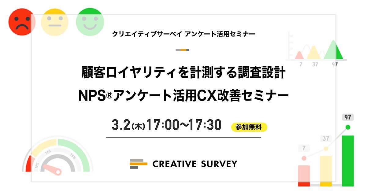 また、セミナーでは弊社サービスの導入企業での活用事例やCREATIVE SURVEYを活用したNPS®︎調査のデモ画面も併せてご紹介します。 NPS®︎調査やCX(顧客体験)向上をお考えの担当者さまはぜひご参加ください。