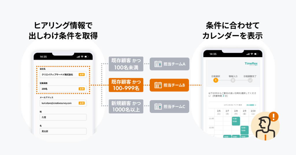 Ask Oneのフォームで企業名やエリア、検討製品などの項目を入力することで、アサインするべき担当チームのTimeRexカレンダーを出し分けるように設定し、自動的に顧客ごとに最適なアサインができるフローを構築しています。