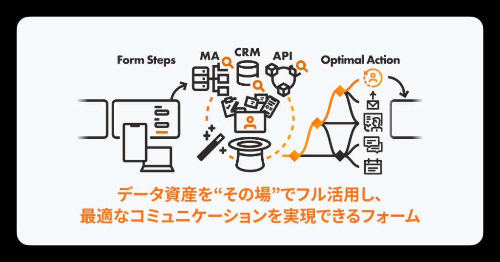 Ask Oneのフォームにデータが入力されると、CRMやMAなどの自社データベースや公開されているオープンAPIからデータ資産をリアルタイムに参照して活用することが可能になり、フォーム上の体験を変えることができます。