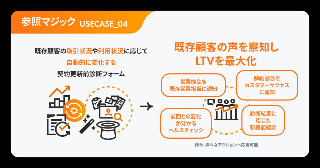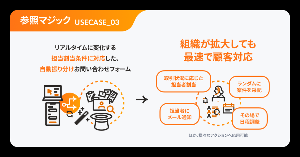 参照マジックを使うことで、顧客の契約内容や直近の利用状況などをリアルタイムに取得し、顧客に応じて情報や設問を出し分け、最適なヒアリングができるようになります。