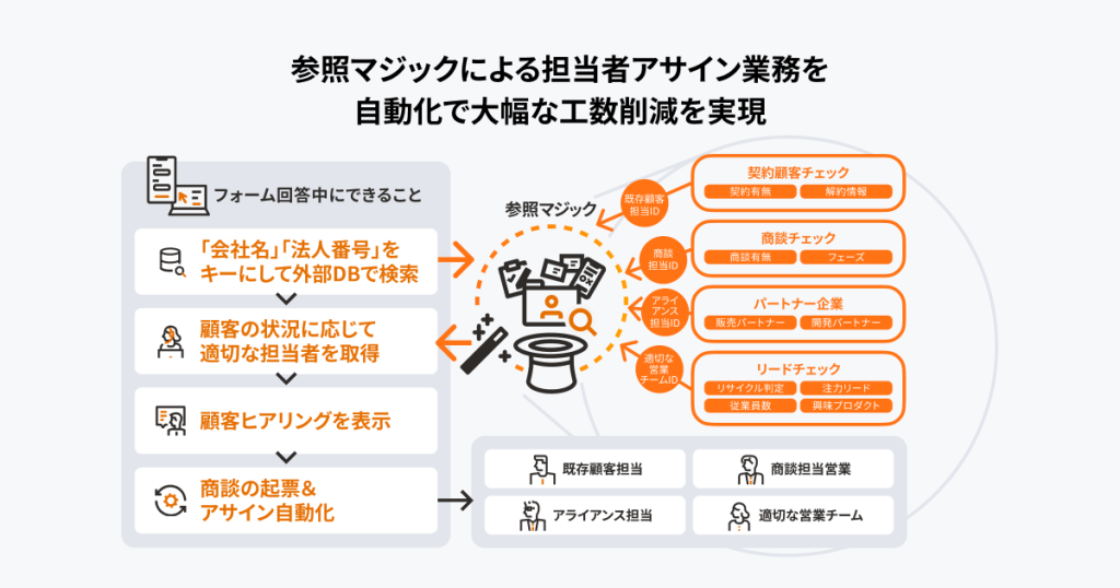 参照マジックを活用し、Salesforceやマーケティングオートメーションツールに保持する顧客データによってフォームの体験を柔軟に設計できるため、顧客ごとに最適な営業判断やアクションをフォーム上で実行することが可能になります。
