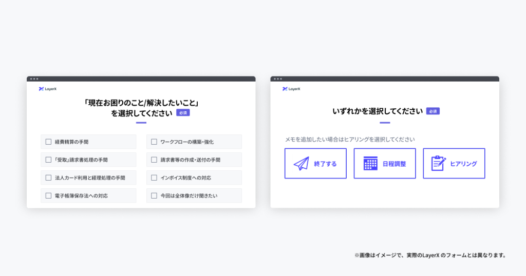Ask Oneは23種類の豊富な「質問タイプ」と「分岐条件」などを組み合わせて柔軟なヒアリングフォームを作成することができるだけでなく、デザインのカスタマイズ性に優れているため、LayerXのブランドイメージを崩すことなくフォームを設計することが出来ます。これにより、顧客にヒアリングフォームやその中で表示される説明資料を見ていただきながらのブース対応を実現し、顧客体験を向上しながら本当に取得したい情報を柔軟に取得することが可能になります。