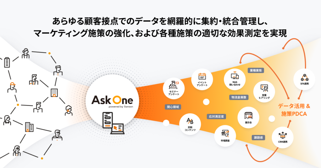 セミナーアンケートやWeb問い合わせフォーム、ヒアリングシートなどあらゆる顧客接点での入力インターフェースをAsk Oneに統合することで、施策ごとのデータの流れを統一し、収集したデータを柔軟に活用する体制を構築することが可能になります。これにより、各マーケティング施策における適切な効果測定ができるようになるだけでなく、次回以降の企画立案への効果的な判断や施策の強化を実現します。