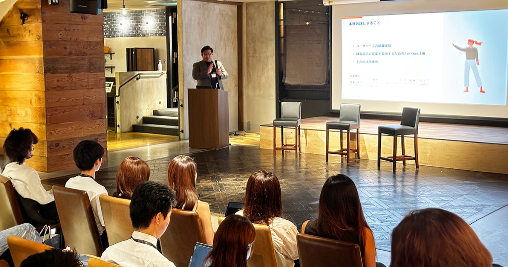 その後、導入企業様の事例紹介として株式会社ユーザベース様にご登壇いただき、「ユーザベースにおけるAsk Oneの活用法」というタイトルで顧客起点組織を実現するためのAsk Oneのメインの活用方法や、商談前アンケートや契約者向けのポータルサイトなどでの幅広いユースケースをご紹介いただきました。