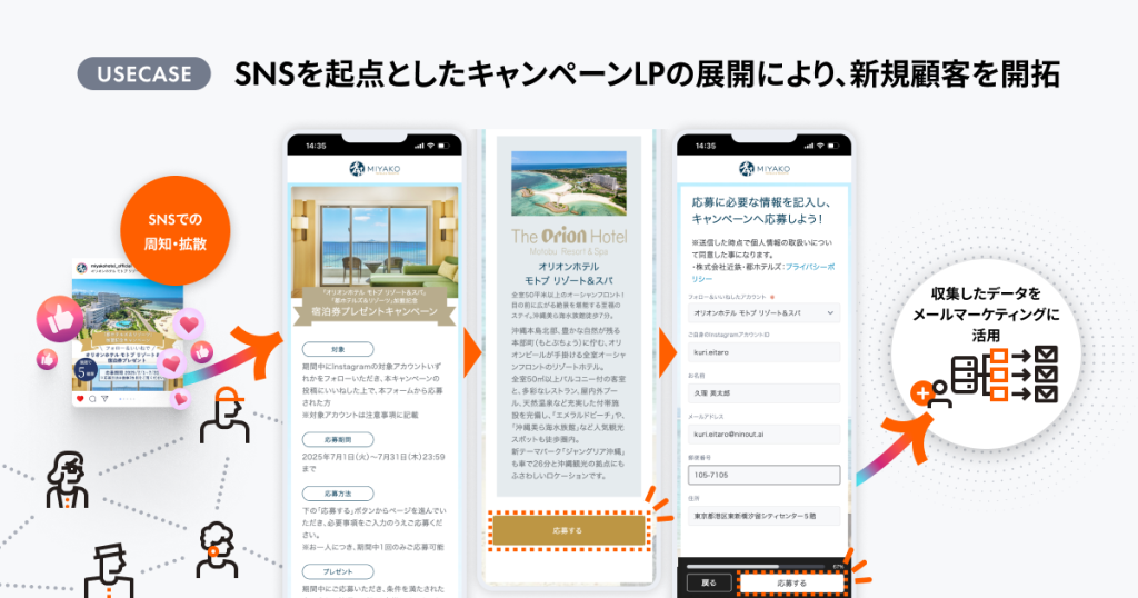 近鉄・都ホテルズが運営する「都ホテルズ&リゾーツ」に新規加盟したホテルの新規集客に向けてキャンペーンページをFan Fan Fanで作成し、SNSで展開することによって、新規加盟ホテルの認知向上と送客を実践するほか、キャンペーンページに付随したアンケートで応募と意識調査を同時に実施。さらに、収集したデータを活用し、その後のメールマーケティング施策まで一気通貫で行う体制を構築しました。