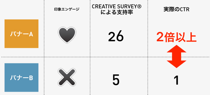 さらに、実際に出稿されたAのバナーとBのバナーを一定期間出稿し、それぞれのCTR(クリック率)を比較した所、なんと2倍以上の差がつくという結果がでました!