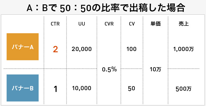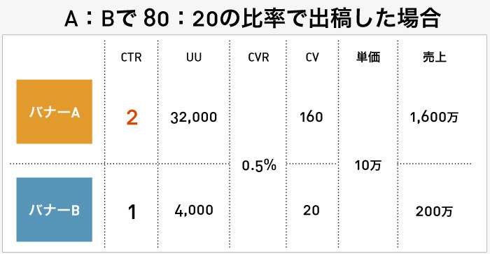 下記の図は、AとBのバナーでスプリットランを行った際の出稿比率を、「A:Bで5:5」にした場合と「A:Bで8:2」にした場合を比較したシュミレーションです。
