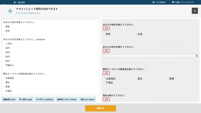 簡単な記述で一括で登録できます。シンプルなアンケートであれば、質問作成の時間が大幅に削減されるので、アンケート作成の頻度が高いユーザーさまはぜひご利用ください!