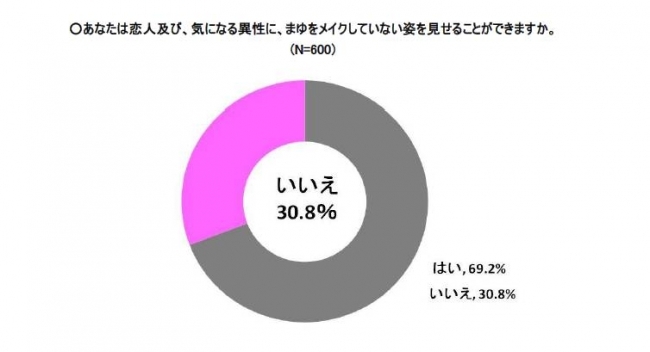 まゆのすっぴん姿に対して、約3人に1人である約31%が、恋人及び、気になる異性にまゆをメイクしていない姿をみせることができないと回答しました。好きな異性にはまゆだけでもメイクをしていれば、その他がノーメイクでもOKな女性が多いということがわかりました。