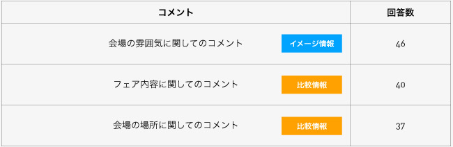 それに続けて「フェア内容に関してのコメント」「会場の場所に関してのコメント」の順に多く書き込まれています。