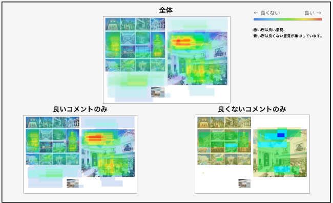 意見の書き込まれたエリアに色が重なり、良いコメントが集中してる箇所が赤く、良くないコメントが書き込まれている箇所が青く表示されています。
