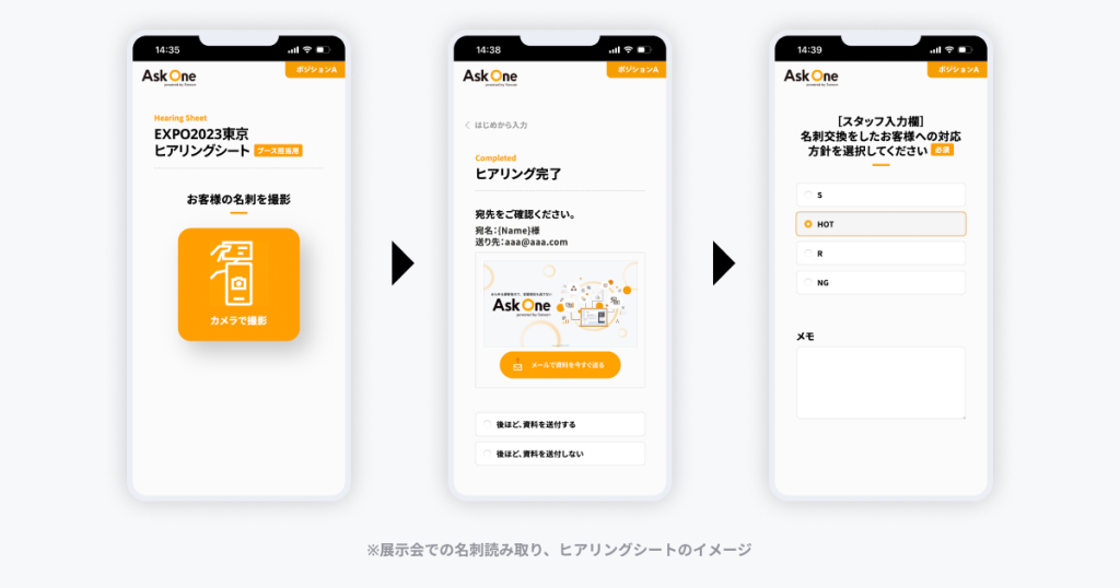 Ask Oneは、当社株主であるSansanのデータ化ノウハウにより開発された、精度とデータ化速度を両立した名刺に特化した独自のエンジンを搭載しております。これにより、名刺情報を瞬時にデータ化し、フォームの回答内容と合わせて各種ツールに即時同期することが可能です。展示会におけるヒアリングシートやセミナーの受付、訪問営業時のCRMへの顧客情報入力など、様々なシチュエーションでの入力負荷を削減します。