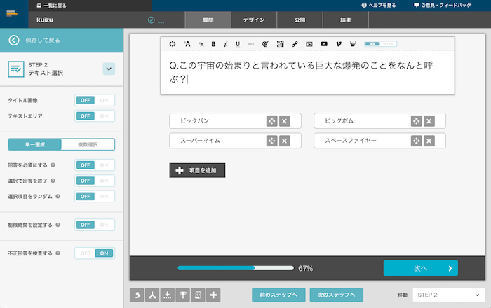まずはクイズの問題文章と回答選択肢を実際に作っていきましょう。サンプルのスーパー宇宙クイズでは選択で回答終了の設定をONにすることで、ボタンを押したら次の画面にスルスル進んでいくような動きになっています。選択肢が単一の時だけ使える機能なので注意してくださいね。
