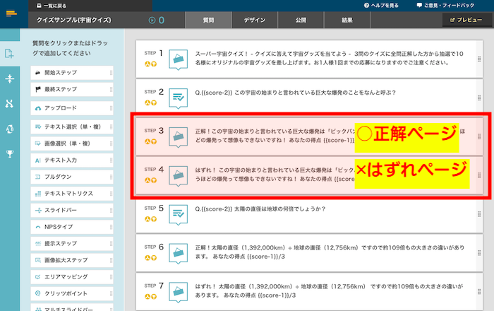 上記の画面のように1問ごとに「正解」と「はずれ」の解説ページを用意します。画像ではQ1の問題に対する正解とはずれを赤枠で囲っていますが、同じ要領でQ2・・Q3・・・と同じ要領で解説ページを設定していきます。ちなみに解説は「開始ステップ」を使うと便利ですよ。サンプルの宇宙クイズでは解説ページの◯と×マークは画像にしています。