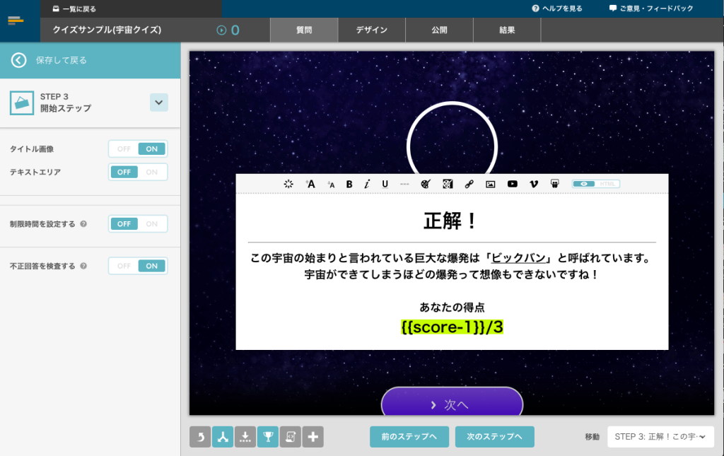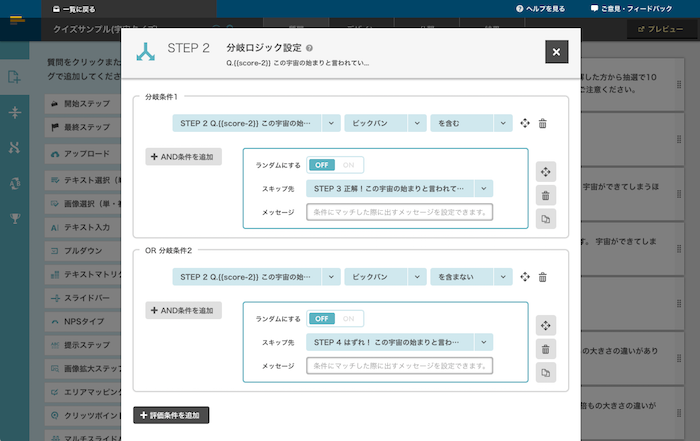 分岐機能を使って「正解」の選択肢を選ぶと正解の解説ページへ、「不正解」の選択肢を選ぶと不正解の解説ページへ遷移するシンプルな分岐を設定しましょう。サンプルでは正解であるビックバンを含む場合はSTEP3の正解ページへ、それ以外ならSTEP4のはずれページに分岐します。同じように正解とはずれの解説にも次の質問への分岐をセットしておきましょう。