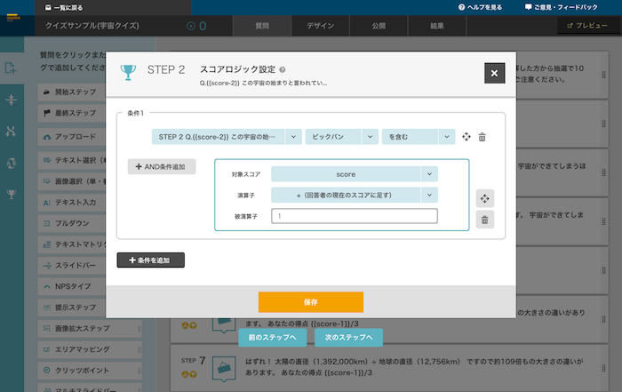スコアロジック機能を使うことで正解したときにスコアを付与することができるようになります。サンプルの場合は「ビックバン」が正解ですのでビックバンを選んだらスコア1点加算としています。
