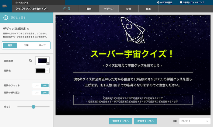 画面のデザインをカスタマイズすることで参加者にとってより楽しいコンテンツにすることができます。サンプルでは宇宙っぽい背景画像をセットしてみました。さらにデザインにこだわりたい場合はカスタムCSSを使うことでより柔軟にデザインをカスタマイズすることもできますよ。